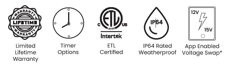 A 300W low voltage landscape lighting transformer with patented in-app voltage switching between 12V and 15V. No moving wires!