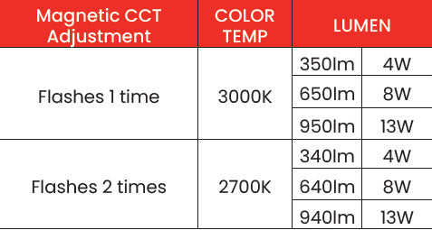 To adjust color temperature, place the magnet in the area just above the etched line on the LEFT side (with the fixture facing away from you) and hold for 1.5 seconds. Light will flash if successful. To adjust again, repeat, pausing for 1.5 seconds in between settings.