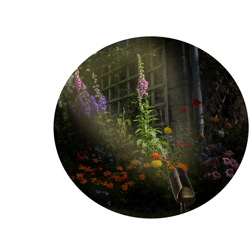 Large MSDPRO uplight/accent light made of solid die-cut brass. Adjust your wattage, lumen output and color temperature via patent-pending Magnetic Step Dimming (MSD) functionality. Using the provided magnetic-key, easily switch between three lumen outputs: 1100lm, 1300lm, or 1495lm, and two color temperatures: 2700K or 3000K. The Large MSDPRO is available in three beam spread angles of 20°, 40° or 65°. IP67 rated. Comes standard with a 4.9 foot lead wire, MSDPRO magnetic-key, 8.75" ground stake and a 10 year manufacturer warranty.
