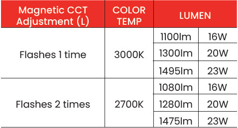 Default Settings Out of Box: 20W, 1300lm, 3000K